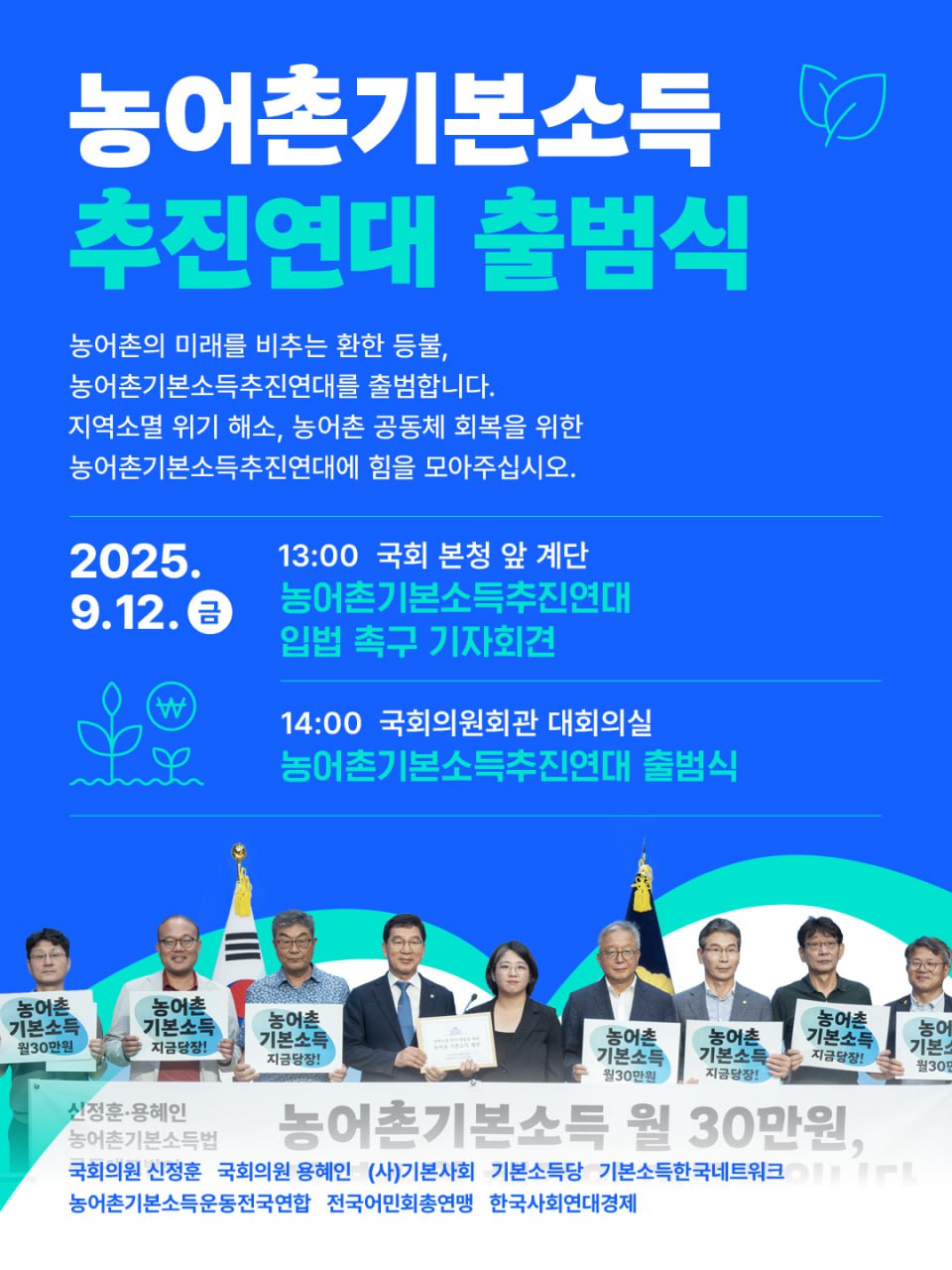 2025년 9월 12일 금요일, 국회에서 “농어촌기본소득 입법 촉구 기자회견” 및 “농어촌기본소득추진연대 출범식”이 있습니다.