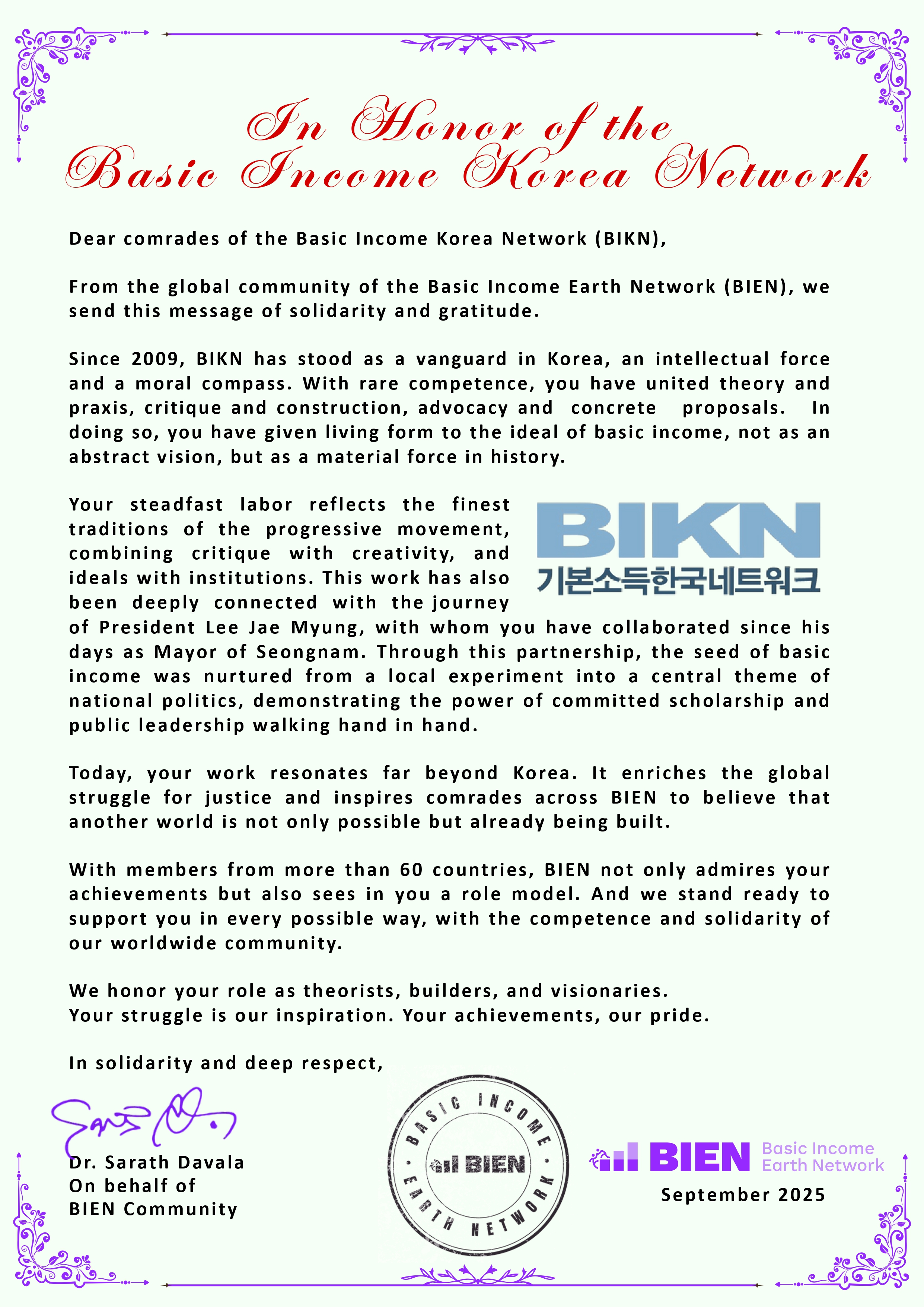 Since 2009, BIKN has stood as a vanguard in Korea, an intellectual force and a moral compass. With rare competence, you have united theory and praxis, critique and construction, advocacy and concrete proposals. In doing so, you have given living form to the ideal of basic income, not as an abstract vision, but as a material force in history.