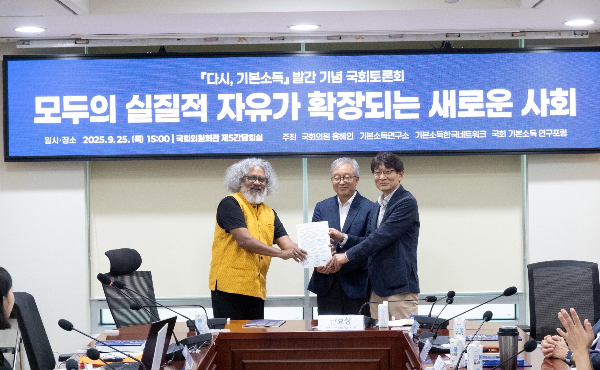 2025년 9월 25일, 『다시, 기본소득: 정치적 지형과 가능한 미래』 발간기념 국회토론회 “모두의 실질적 자유가 확장되는 새로운 사회”에 발표자로 참석한 기본소득지구네트워크(BIEN) 의장 사라트 다발라로부터 기본소득한국네트워크에 대한 BIEN 감사패를 받았습니다. 감사패는 기본소득한국네트워크를 대표하여 안효상 이사장과 강남훈 명예이사장에게 수여되었습니다.